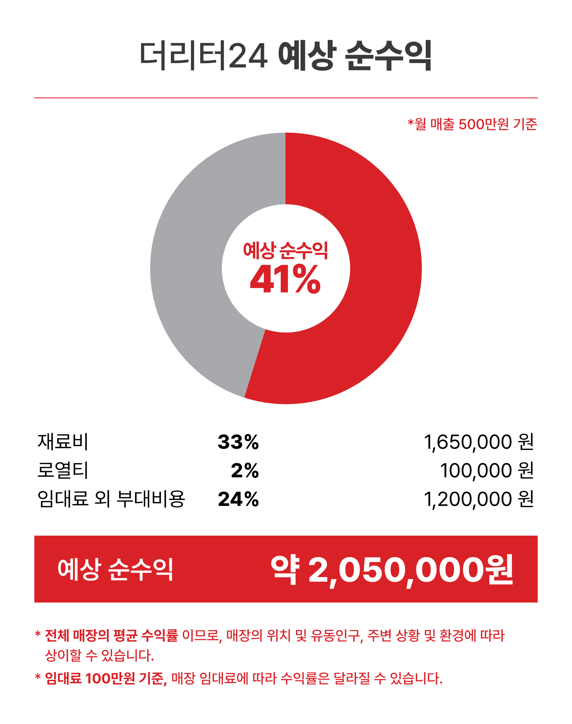 인테리어, 간판은 상가 컨디션(철거,바닥,천정 등) 및 상가 자체 규정에 따라 차이가 있으며 견적 금액은 평균 금액으로 반영, 머신 무상수리 기간은 1년, 원격유지보수 관리비 별도 발생